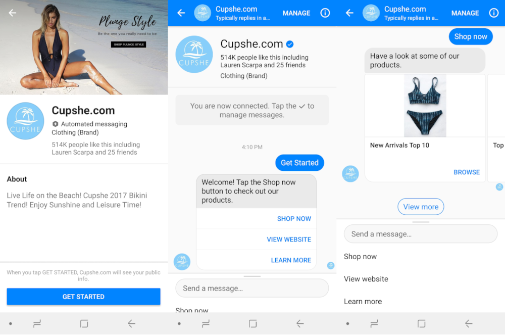 Например, Cupshe позволяет своим 600 000+ фанатам Facebook просматривать и делать покупки в диалоговом режиме на платформе Messenger. Приблизительно 35% его продаж сейчас осуществляются, прямо или косвенно, через социальные сети.