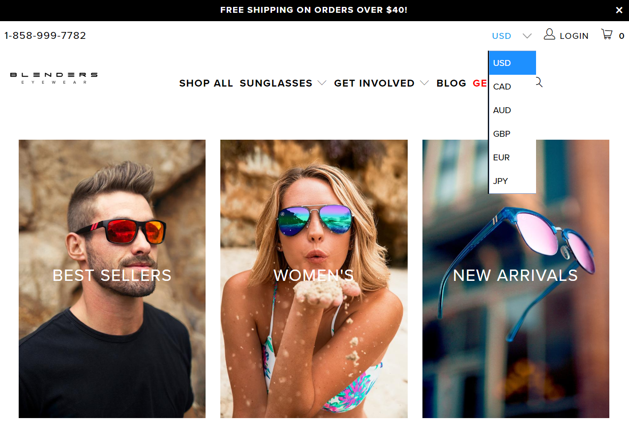 На своем сайте Blenders Eyewear предлагает селектор валют, чтобы клиенты знали, какова будет истинная стоимость продукта.