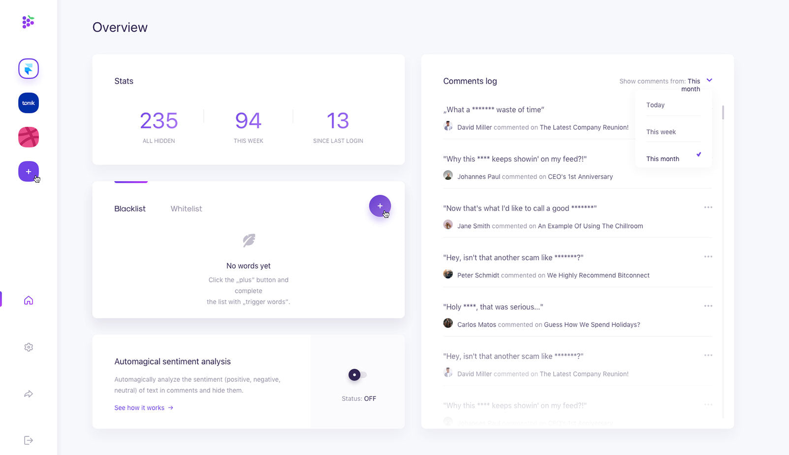 Кислый виноград автоматически сканирует ваш фирменный контент Facebook в режиме реального времени, используя обработку естественного языка и анализ настроений, чтобы определить, когда, по их словам, «комментирует [пускает] глоток слишком большого количества Haterade».