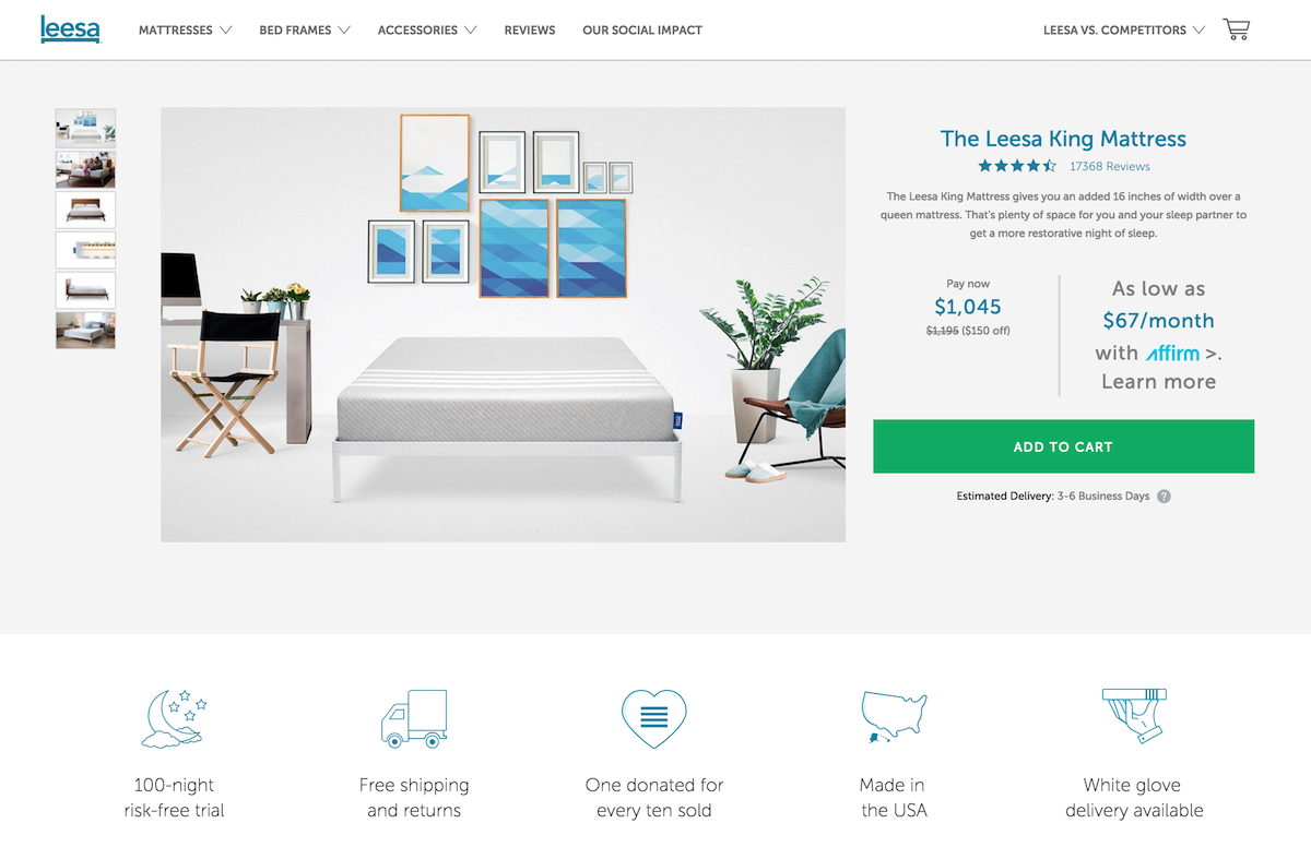 Leesa объединяет два элемента укрепления доверия: (1) «безрисковая пробная версия на 100 ночей» и (2) калькулятор платежей